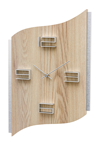 天然木材の木目のオシャレなデザイン掛け時計です。木の温もりで心地良いインテリアに癒しの空間を演出してくれる掛け時計です。金属製の直線のシャープな文字がアクセントポイントです。家具やインテリアに合わせて選べる実用的なオシャレなデザイン掛け時計です。クオーツ式、単三電池使用。
