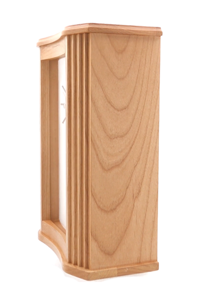 米国BULOVA社(ブローバ社)Bulova Clocks. ミッドセンチュリー・モダン調のチャイム付き卓上置き時計は、透明感のあるアルダー材の無垢木製ケースを採用し、木目の美しさを引き立てるクリアな仕上げが施されています。角度をつけたリブ入りのサイドコラムは、揺れる木製の振り子によってアクセントが添えられています。シルバー仕上げの浮き彫りされた時刻目盛りが、明るい白の文字盤と対照をなし、すっきりとした現代的な印象を与えます。ブローバ・ハーモニック・ウェストミンスター・チャイムは、毎時チャイムを鳴らし、独立した時報機能、音量調節、および夜間サイレントモードの選択機能を備えています。